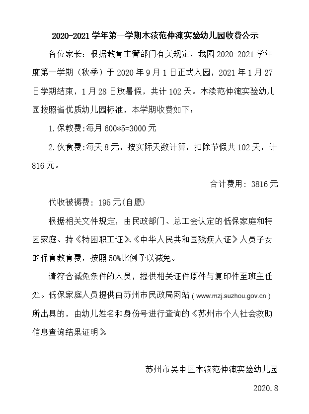 2020-2021学年第一学期木渎范仲淹实验幼儿园收费公示