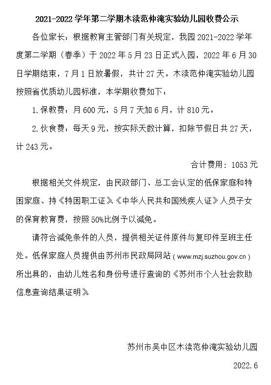 2021-2022学年第二学期木渎范仲淹实验幼儿园收费公示